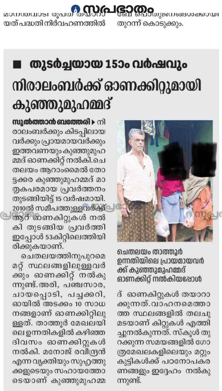 15 വർഷമായി കുഞ്ഞഹമ്മദിക്ക എന്ന ഈ മനുഷ്യൻ ഓണം ആഘോഷിക്കുന്നത് ഇങ്ങനെയാണ്. വയനാട്ടിലെ ചിതലയത്തും പരിസരത്തുമുള്ള 50 ഓളം ആദിവാസി കൂരകളിലേക്ക് ഓണക്കിറ്റുകൾ എത്തിക്കും. പറ്റേ കിടപ്പിലായി പോയവരെ തിരഞ്ഞെടുത്താണ് ഇപ്പോൾ പ്രധാനമായും കിറ്റ് നൽകുന്നത്.